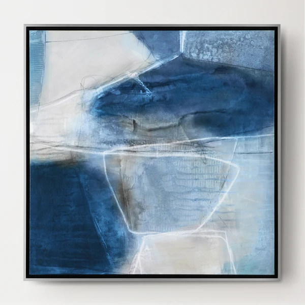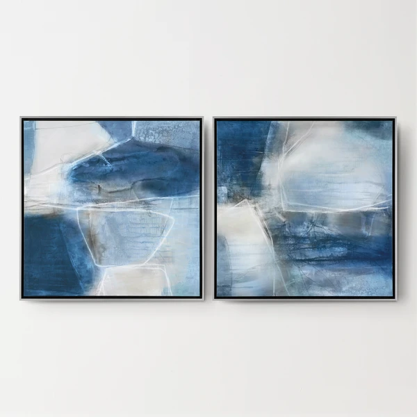 Nuanced neutrals and shades of sapphire take shape in the Bombora abstract prints, a series of 2.