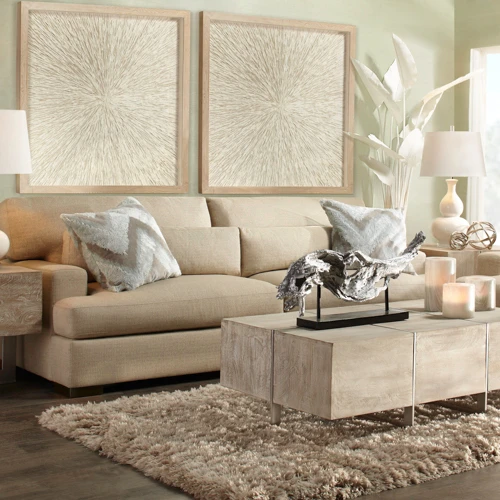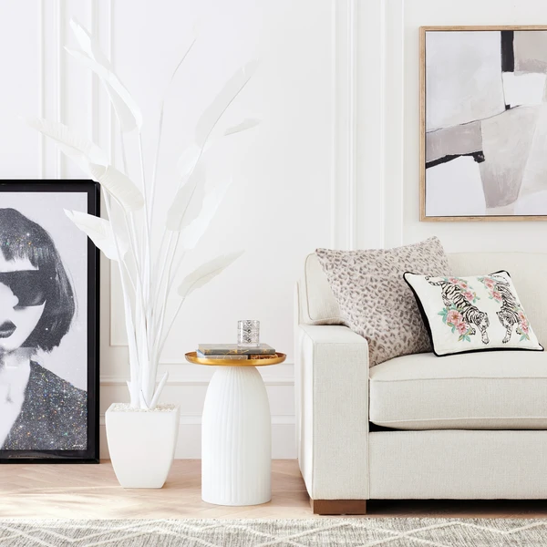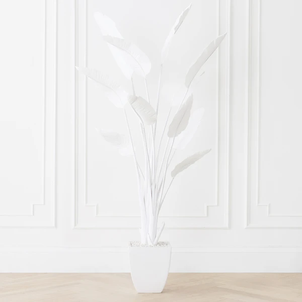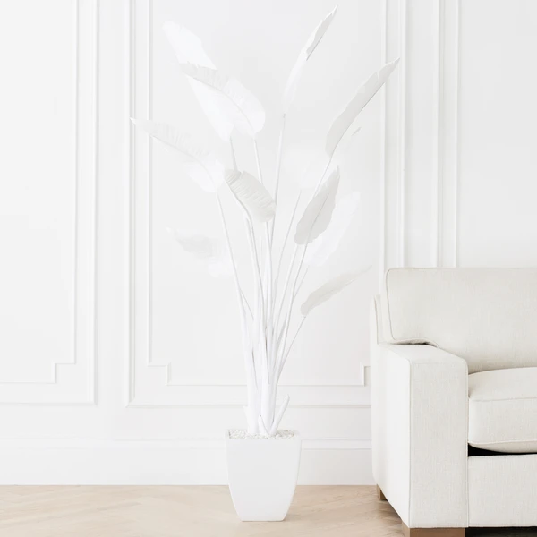 Interpreted in neutral white, this Palm tree offers just a subtle suggestion of lush tropical foliage. Already arranged in a tailored pot, it measures 72ā tall.