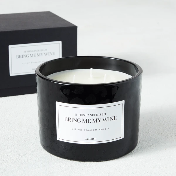 Presented in a black glass vessel with a tonal leopard print and sassy saying, this triple-wick candle features an aromatic citron blossom cassis scent and arrives in a handsome box, ready for gifting.