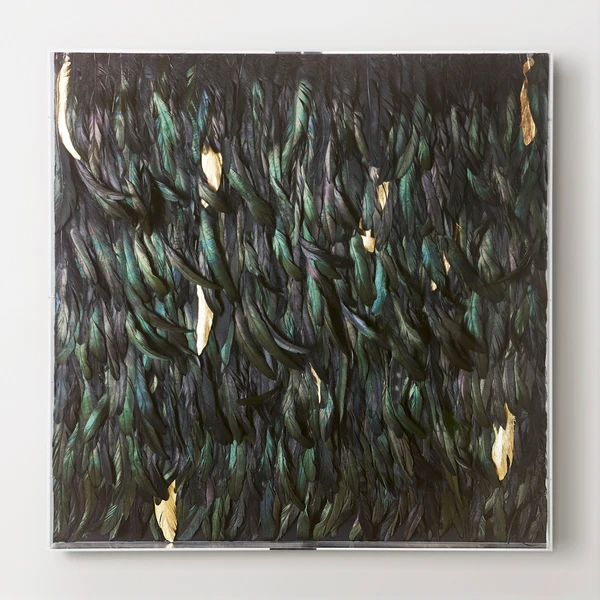 Perfect for adding texture and drama to your wall, this artful arrangement of black feathers is embellished with gold accents and displayed in a clear acrylic shadowbox frame.