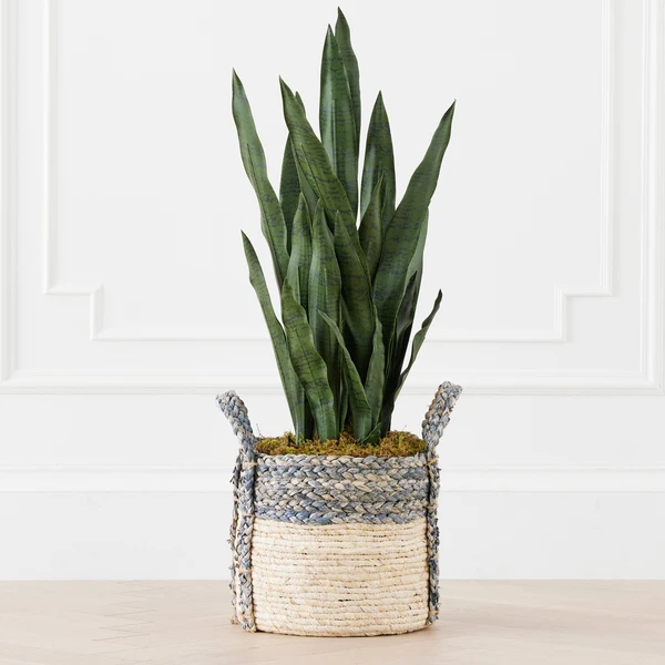 A visually stunning and stately faux arrangement featuring Mother in Law’s Tongue in a woven blue and tan basket.