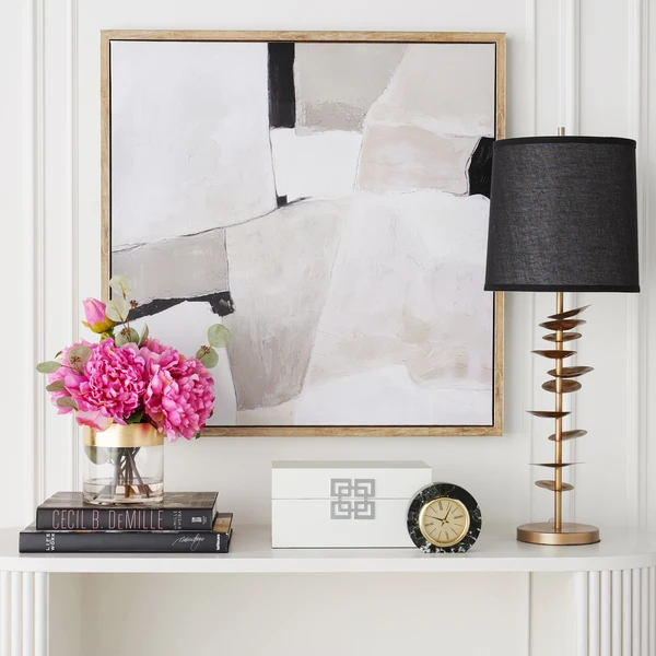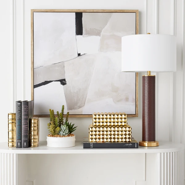 Pieces is a gallery-wrapped canvas with hand-applied pallet knife embellishment set in a blonde and champagne (2-tone) floater frame.