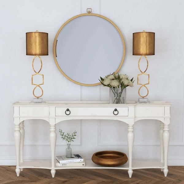 Our Royal Mirror has a gold leaf finish and is accented with a sleek pocket watch bow detail.