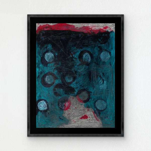 Displayed under glass in a black frame, this print enlivens any wall with its abstract composition and vibrant hues.